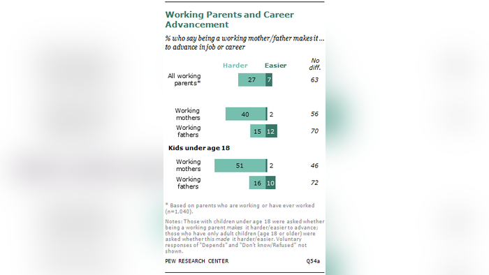 As any parent knows, combining work and family life can be complicated. The survey asked working parents how balancing work and family had affected their careers. Roughly a quarter (27%) said being a working mother or father had made it harder for them to advance in their job or career, and women were much more likely than men to express this view.