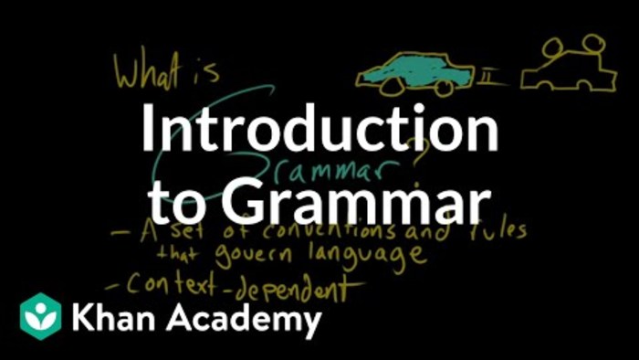 Grammar is broadly defined as all the rules and structures that outline the proper use of language. This website does a good job of breaking down the definition of grammar, however, Khan Academy provides a more thorough introduction to grammar below.